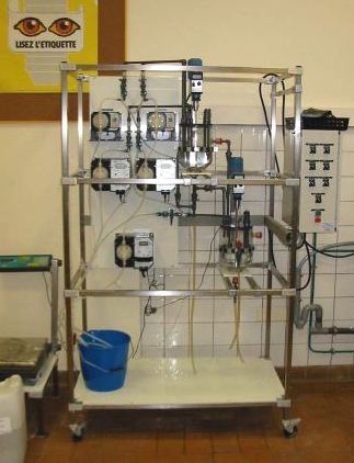 Le pilote de réacteurs en cascade est constitué de deux réacteurs en verre de capacité utile de 3 litres. Chaque réacteur est équipé d’un agitateur de type " ancre entraîné par un moteur à vitesse réglable, d’un orifice de vidange par débordement permettant de garder un niveau constant dans le réacteur, et d’une vanne de fond de cuve permettant la vidange de la masse réactionnelle. Chaque réacteur est muni d’un couvercle permettant :