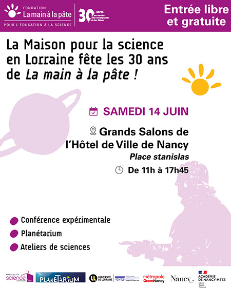 - À l’occasion de cet anniversaire, la Maison pour la science en Lorraine vous donne rendez-vous samedi 14 juin dans les Grands Salons de l’Hôtel de Ville de Nancy.