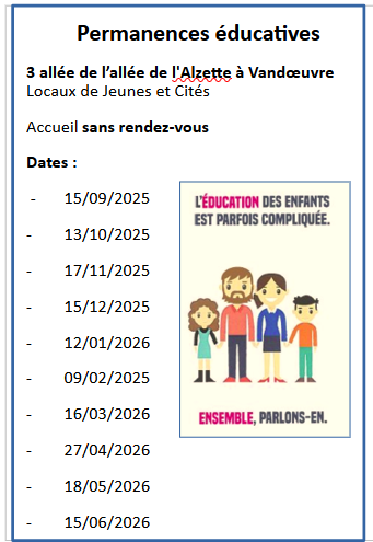 Les permanences éducatives accueillent les parents volontaires sans rendez-vous à l’association Jeunes et cités de Vandoeuvre afin de les accompagner dans les difficultés éducatives qu’ils rencontrent.