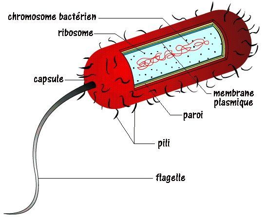 Voici une bactérie : c'est une cellule plus simple que celles que nous avons déjà vues. La particularité la plus intéressante est l'absence de noyau ( ou plutôt de membrane nucléaire ). On appelle ce type de cellules "procaryotes".