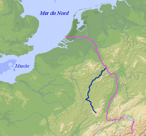 Elle traverse de nombreuses villes de Lorraine : Epinal, Toul, Metz puis elle sert de frontière naturelle entre le Luxembourg et l'Allemagne. Elle se jette alors dans le Rhin, ce fleuve qui prend sa source dans les Alpes et se jette finalement dans la Mer du Nord aux Pays bas à Rotterdam.