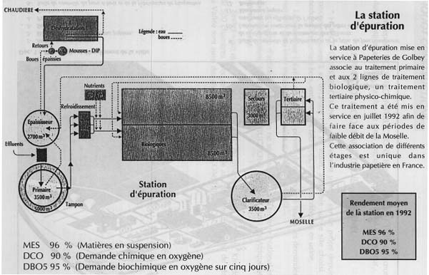 particulièrement performante. Le traitement comporte les étapes suivantes : - prétraitement par dégrillage, - neutralisation à pH 6-7, - décantation primaire pour éliminer les matières en suspension, - réfrigération, - traitement biologique par boues activées, - décantation secondaire, - traitement tertiaire physico-chimique. Après traitement, les eaux épurées, neutralisées et contrôlées sont pompées vers la Moselle. L'entreprise assure une surveillance constante de l'impact de l'exploitation sur l'environnement et publie chaque année, en toute transparence, un bilan environnement. En ce qui concerne les rejets, les limites très strictes imposées afin de respecter la qualité de la Moselle et celle de l'air dans l'agglomération d'Epinal ont été respectées. De par sa taille, l'entreprise