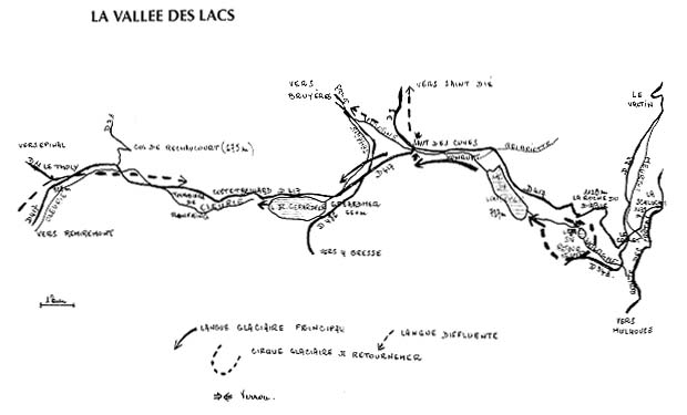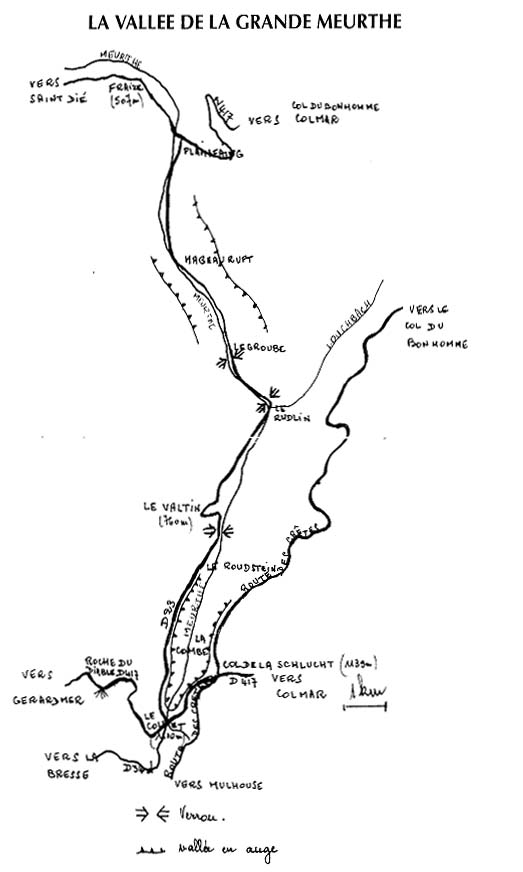LA VALLEE DE LA GRANDE MEURTHE Entre les sources et le RUNDSTEIN Les eaux de plusieurs torrents au Nord du col du Collet se rassemblent pour constituer la Meurthe qui traverse ensuite par des rapides vers 900 mètres d'altitude un seuil rocheux considéré comme un verrou. Au dessous de 890 mètres, le fond s'élargit et on est en présence d'une vallée en auge, à versants abrupts. Le Palier de la Combe a une pente de 2%, la Meurthe s'encaisse alors sur un fond plat. A l'avant du Rundstein le fond s'élargit en formant une cuvette occupée par un petit lac, à l'aval le verrou du Valtin. Lors de périodes froides, l'alimentation en neige ou glace a été plus importante sur le versant Est. On ne peut considérer comme cirque que l'amphithéâtre à l'ouest de la roche du Tanet. Le versant devait être couvert d'une sorte de calotte d'épaisseur assez régulière et cette glace s'écoulait lentement vers l'ouest et s'accumulait dans la vallée. Le verrou du Valtin A l'aval du Rundstein, la Meurthe s'encaisse dans la vallée devenue plus étroite, dans les derniers deux cent derniers mètres avant le village du Valtin, le torrent creuse un défilé dans le granite des crêtes. la vallée amont de la Meurthe est don suspendue au dessus du Valtin. Ce verrou est en rapport avec un jeu de failles responsables du décalage vers le nord-Ouest du tracé de la Meurthe. ![]() Entre le Valtin et le Rudlin La Meurthe coule dans une vallée en auge qui se termine brusquement au Rudlin, la Meurthe s'enfonçant vers l'ouest dans une gorge. Dans le prolongement de la vallée en auge, la vallée de Louchbach descend vers le sud-Ouest, sens opposé à celui de la Meurthe, l'exposition vers le sud a du favoriser la fonte rapide de la glace. A l'aval du Rudlin la vallée de la Meurthe montre une succession de défilés et de sections planes. La rivière scie la roche à l'endroit de verrous, le plus important étant celui de Groube qui apparaît comme une colline barrant la rive droite de la vallée et la dominant d'une cinquantaine de mètres. A Habeaurupt le fond plat fuvio-glaciaire s'emboîte dans une sorte de terrasse qui peut être assimilée à une moraine terminale. En conclusion les formes et les dépôts témoignent d'un ennoyage par les glaces jusque vers 917 mètres d'altitude au moins au niveau du verrou du Rudlin, ce qui donne plus de deux cents mètres d'épaisseur au glacier de la grande Meurthe en amont du verrou (jusqu'à 260 mètres au niveau du Rundstein, 225 mètres au Rudlin,200 mètres à Habeaurupt.